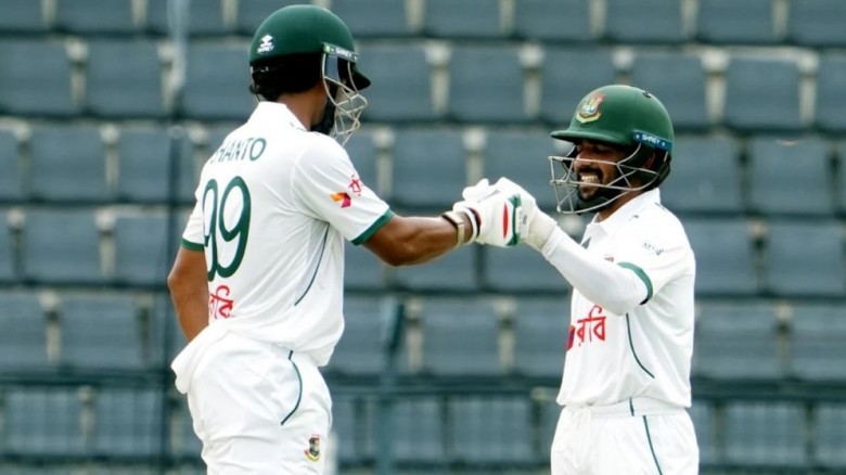 এদিন মধ্যাহ্নভোজরে পর ব্যাট করতে নেমে ব্যক্তিগত ৪০ রান করে সাজঘরে ফেরেন অধিনায়ক শান্ত। এরপর হাল ধরতে নেমে অভিজ্ঞ মুশফিক ফিরে যান মাত্র ৪ রান করে। ধাক্কা সামাল দিতে না পেরে সাজঘরের পথে হাঁটা দেন ফিফটি তুলে নেওয়া অভিজ্ঞ মুমিনুল হক। তিনি করেন ৫৬ রান।